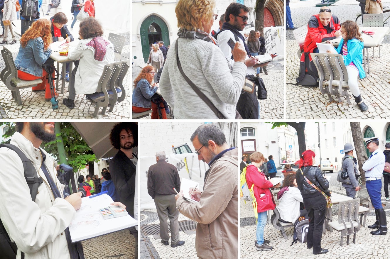 After a 3-hour sketching session we had a lunch break (which included some sketching again ;)), and arrived to the our final sketching point - Praça do Comércio, well-burned in my memory since the final Sketchcrawl of the Lisbon USk Symposium took place there. Now, when we were warmed up, and had practiced sketching people in action and describing their emotions through their expressions and body language, we were ready to put them in their surroundings. So, in the final exercise sketchers asked to put their "heroes" into the scene. Everybody spread out looking for the interesting stories.